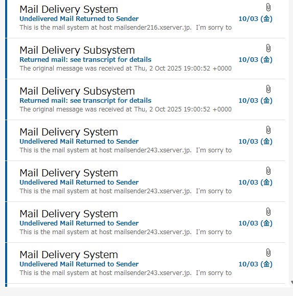 しかし、「エックスサーバーのサポートがパスワードを変更する前に送付されてしまったスパムメール」を止める手立てはなく、このようなスパムメールのエラー戻りはだいたい「数日間」は続きます。