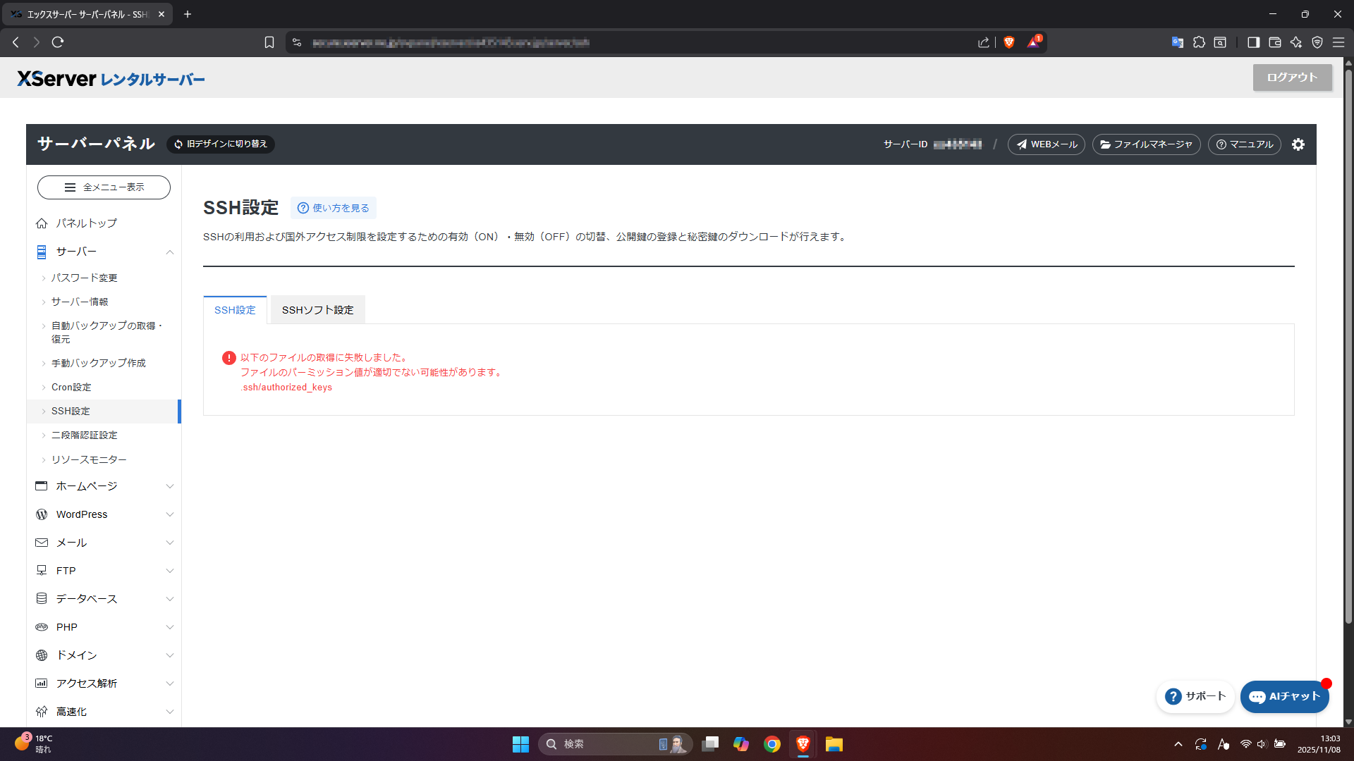 FileZillaからSSHのフォルダとファイルのパーミッションを確認しましたが、フォルダ=700、ファイル=604で特に問題があるようにも見えません。