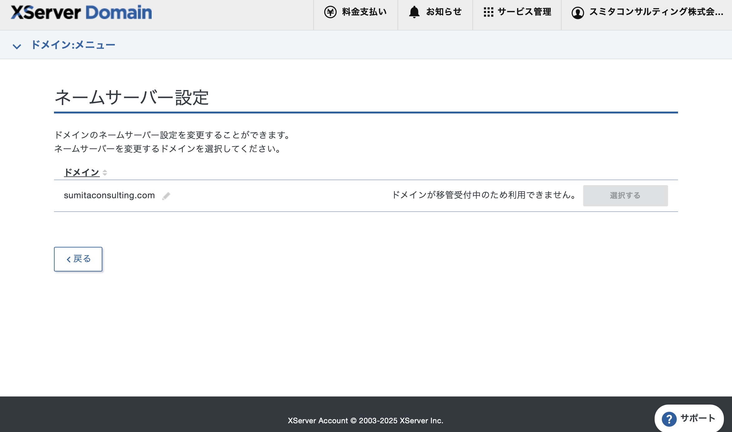 「独自ドメインを取得した他社」での設定が必要とのことでしたが、独自ドメインを取得したGoogleのAdminからDomains→Manage Domain→sumitaconsulting.com(これが設定しようとしているドメインです。)のView Details→MANAGE DOMAIN (via Squarespace)と進めていくと、There are no domainsと表示されました。エックスサーバーの管理画面ですでにドメインはGoogleからエックスサーバーに移管してあります。したがって、NSの設定はエックスサーバー側で設定すれば良いと考えたのですが、いかがでしょうか。下記URLの通り、ネームサーバーの設定をしようとしたところ、NSサーバー設定ができないようになっていました。どのような手順を踏めば、NSサーバーが設定できますでしょうか。